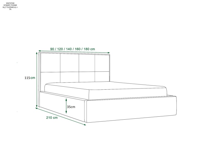 Model wyposażony jest w wysokie zagłowie o wysokości 115 cm, które zapewnia komfortowe oparcie, np. podczas czytania lub oglądania telewizji w łóżku. Wysokość ramy bocznej wynosi 35 cm, co ułatwia wstawanie i dodaje całej konstrukcji wizualnej lekkości. Powierzchnia spania zaczyna się od 90x202 cm, co czyni łóżko idealnym rozwiązaniem do pokoju młodzieżowego, gościnnego lub dla jednej osoby.